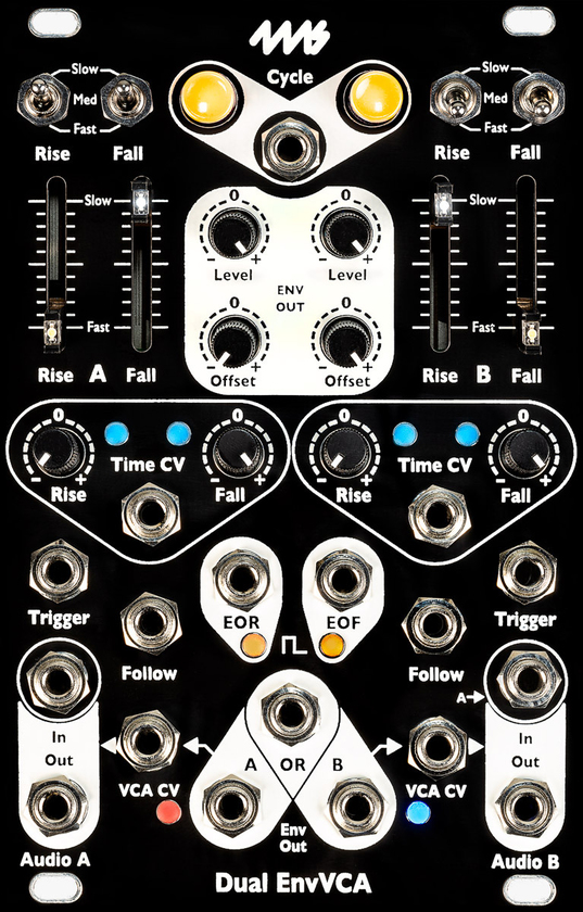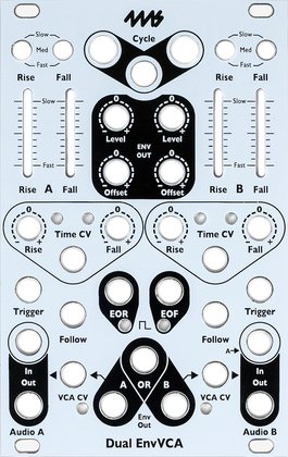 The Dual EnvVCA is a two-channel analog linear envelope generator with two fully independent low-noise exponential VCAs. With time ranges from 30 minutes to 8kHz, it can be used as an LFO, slew limiter, ASR/ADSR complex EG, audio-rate oscillator, stereo audio/CV VCA, envelope follower, sidechain processor, and general utility module. The outputs can be attenuated, inverted, and offset without disrupting the VCA, making it a versatile modulation source.
