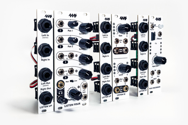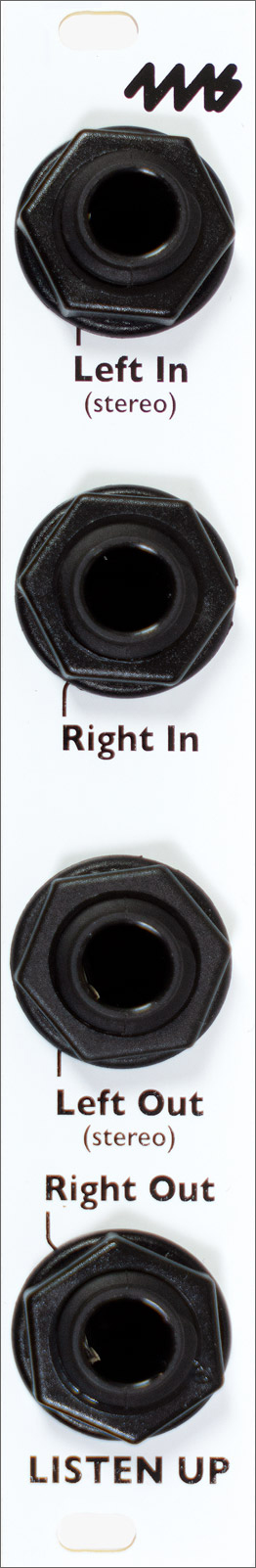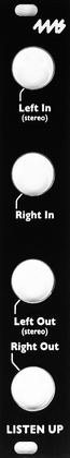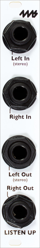 The Listen Up is a small passive expander for the Listen modules that provides stereo 1/4" (6.35mm) jack inputs and outputs. It connects to one or two Listen modules and/or WAV Recorder module with the included 3-pin cables. There are four 1/4" jacks arranged in left/right pairs. The left jack of each pair can be used as a TRS stereo jack if the right jack is unpatched.