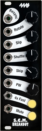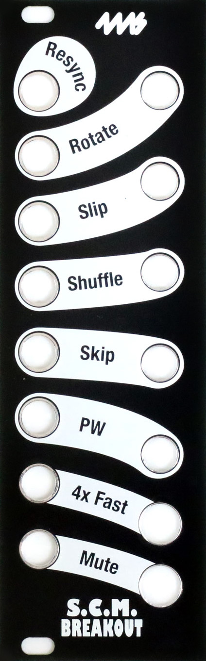 DIY replacement faceplate for the Shuffling Clock Multiplier Break Out. Black background with white artwork.
