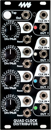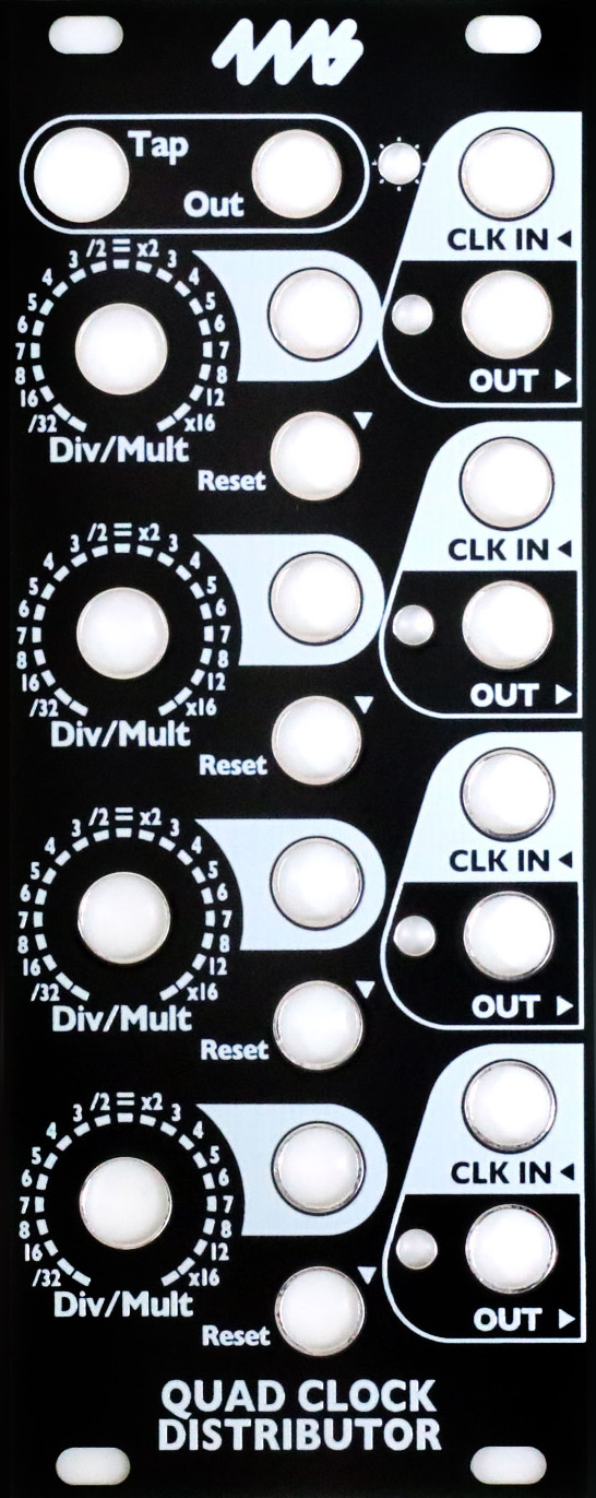 DIY replacement faceplate for the Quad Clock Distributor. Black background with white artwork.