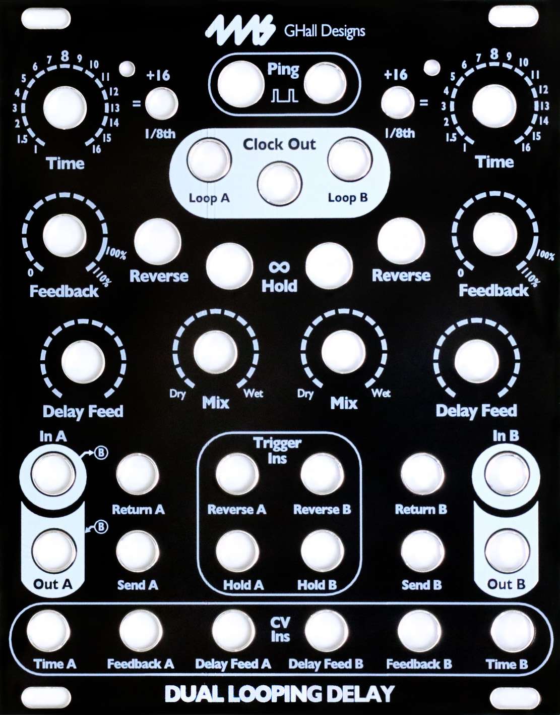 DIY replacement faceplate for the Dual Looping Delay. Black background with white artwork.