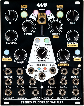 DIY replacement faceplate for the Stereo Triggered Sampler. Black background with white artwork.