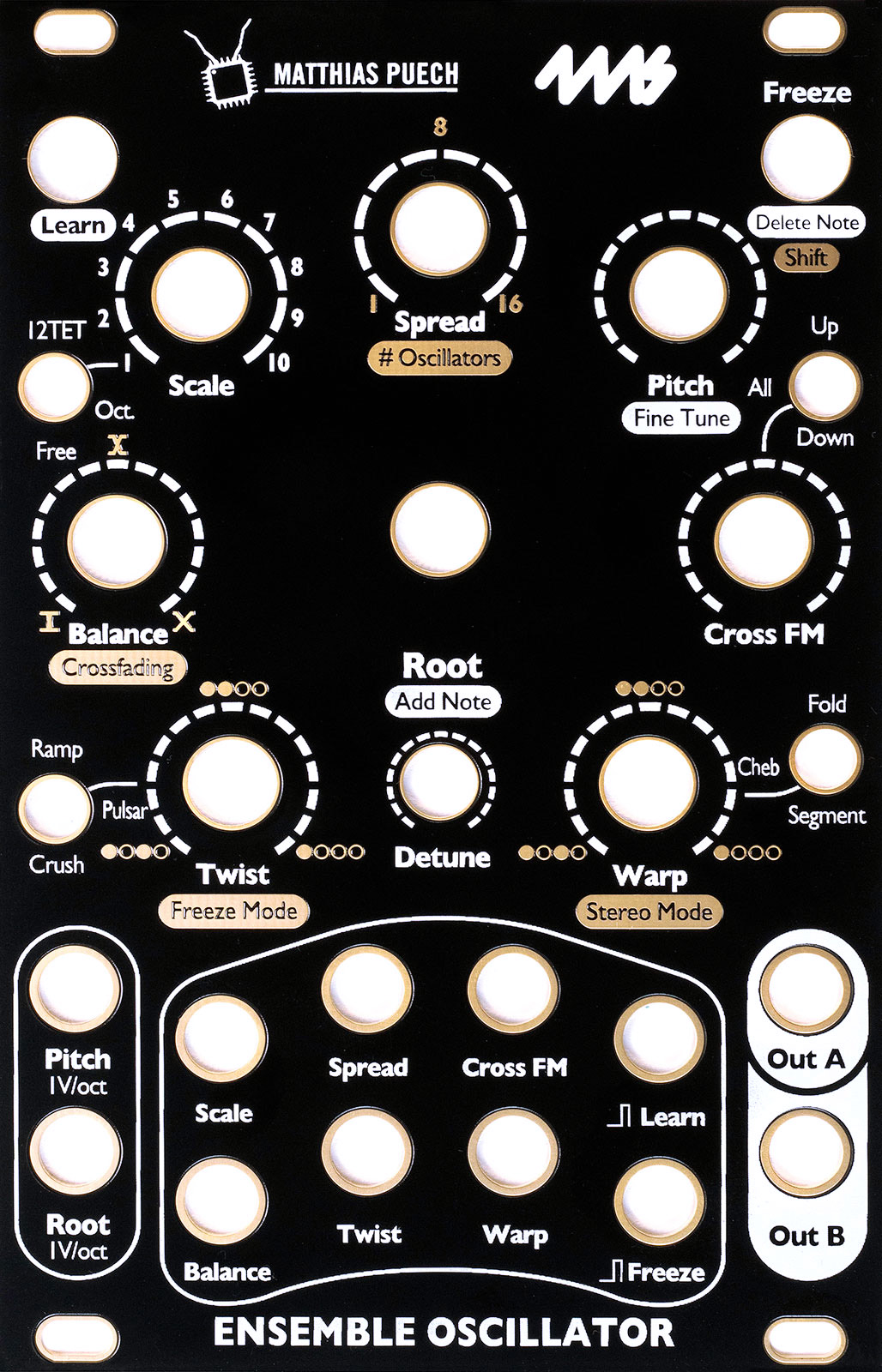 DIY replacement faceplate for the Ensemble Oscillator. Black background with gold and white artwork.